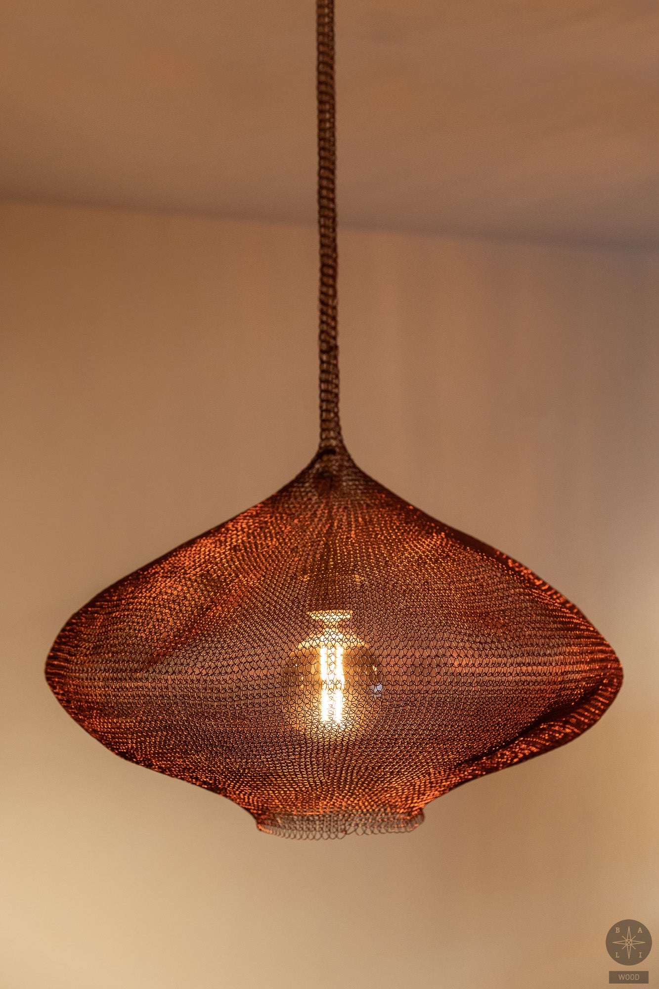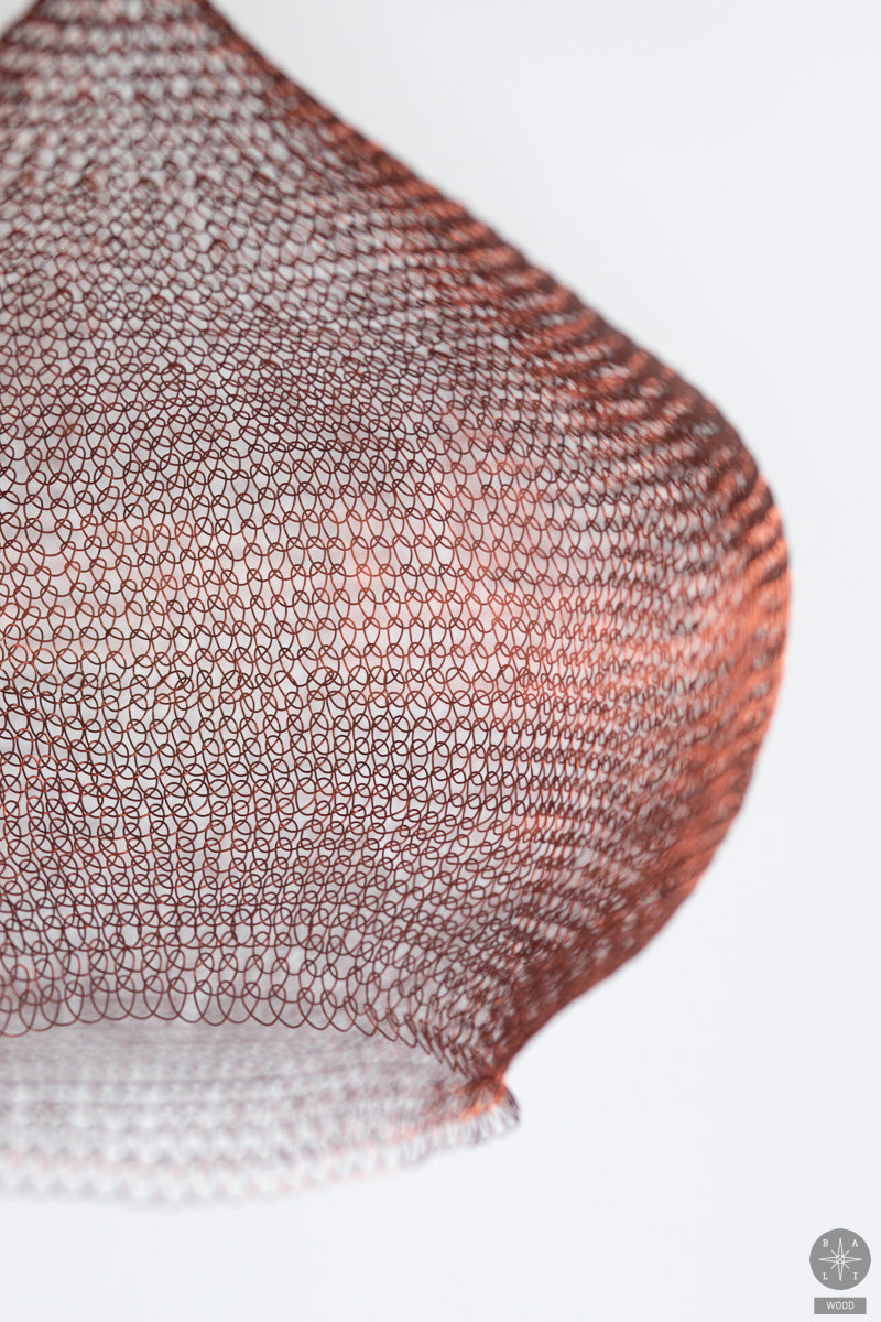 A handmade woven lampshade made of copper from Bali is an elegant, decorative interior accent that creates a warm, cozy atmosphere.
