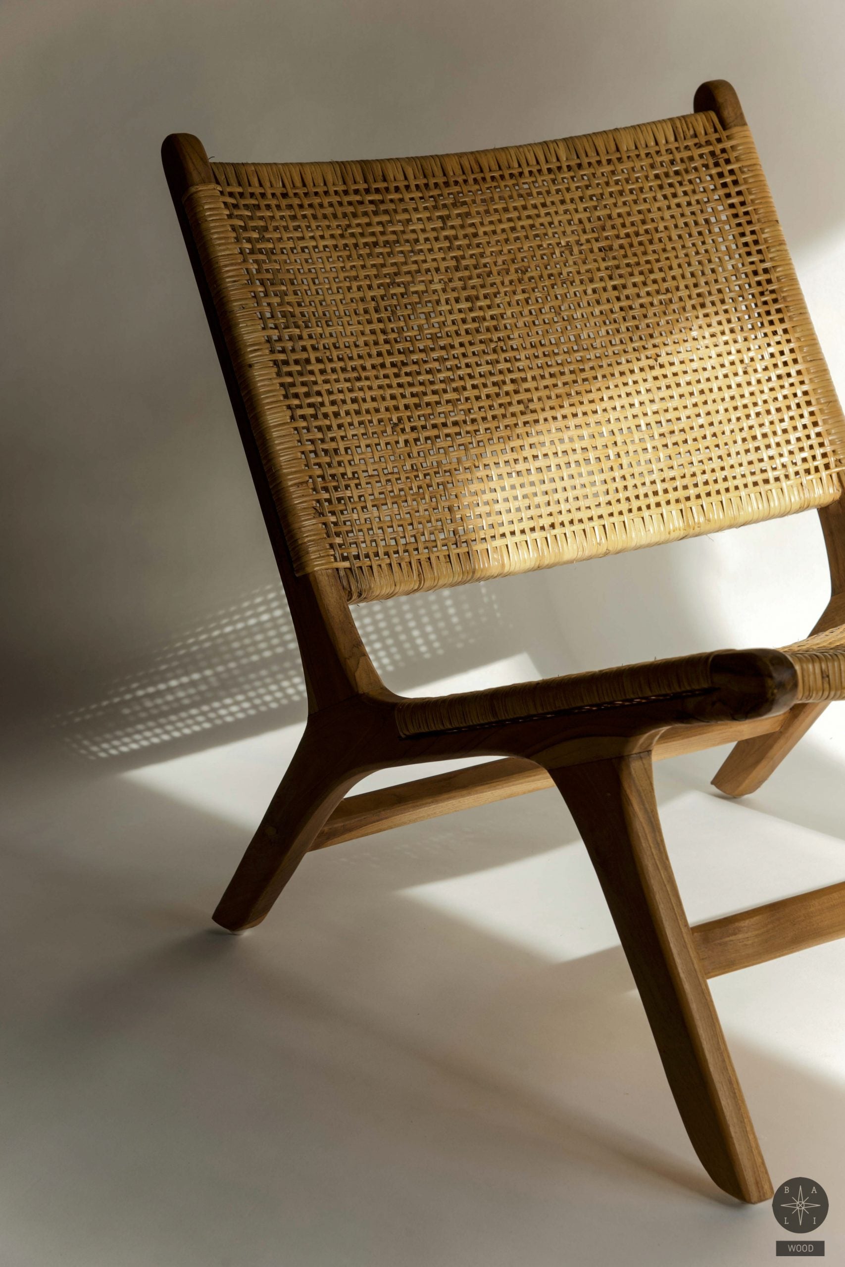 Low chair made of teak wood and natural rattan