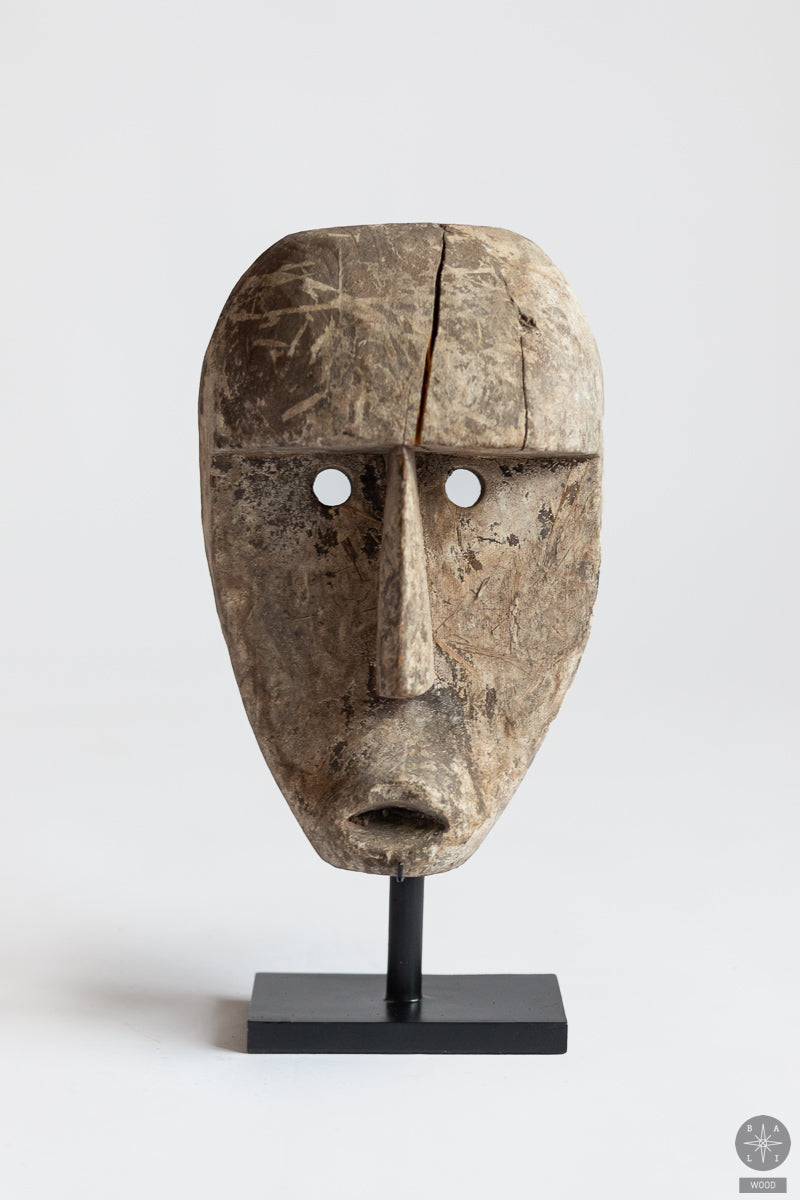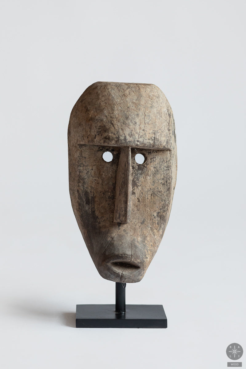Teak wood mask on a metal stand